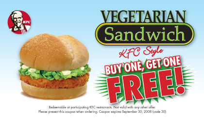 To celebrate the groundbreaking new sandwich, KFC Canada is offering a buy-one-get-one-free coupon for a limited time only! Now through September 2008, present this coupon at participating KFC Canada restaurants when purchasing a Classic Vegetarian Sandwich and you'll receive a second sandwich absolutely free! (Click here for the English version of the coupon, and click here for the French version.)