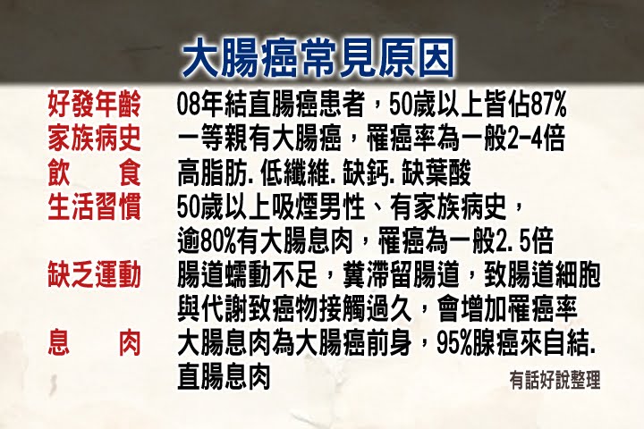 根據國民健康署統計,十年來,國人大腸癌和胃癌的總發生人數已超過15萬人,台灣人的腸胃壞菌,又高出日本人30倍,現代人外食居多,吃肉不吃菜,也是造成腸胃不健康的主因。一名30歲的上班族林小姐,肉食主義者,又常外食,結果去年檢查發現有1公分的瘜肉,開刀割除後,開始規律運動,多吃蔬果和優酪乳,了解健康的重要。