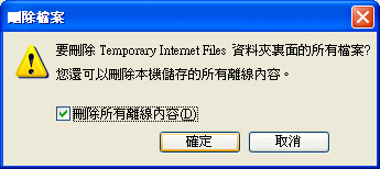 3.勾選刪除所有離線內容,並按確定,稍等瀏覽器處理完畢即可。由於有時電腦中的快取網頁很多,所以處理時間會依每部電腦的狀況不同。